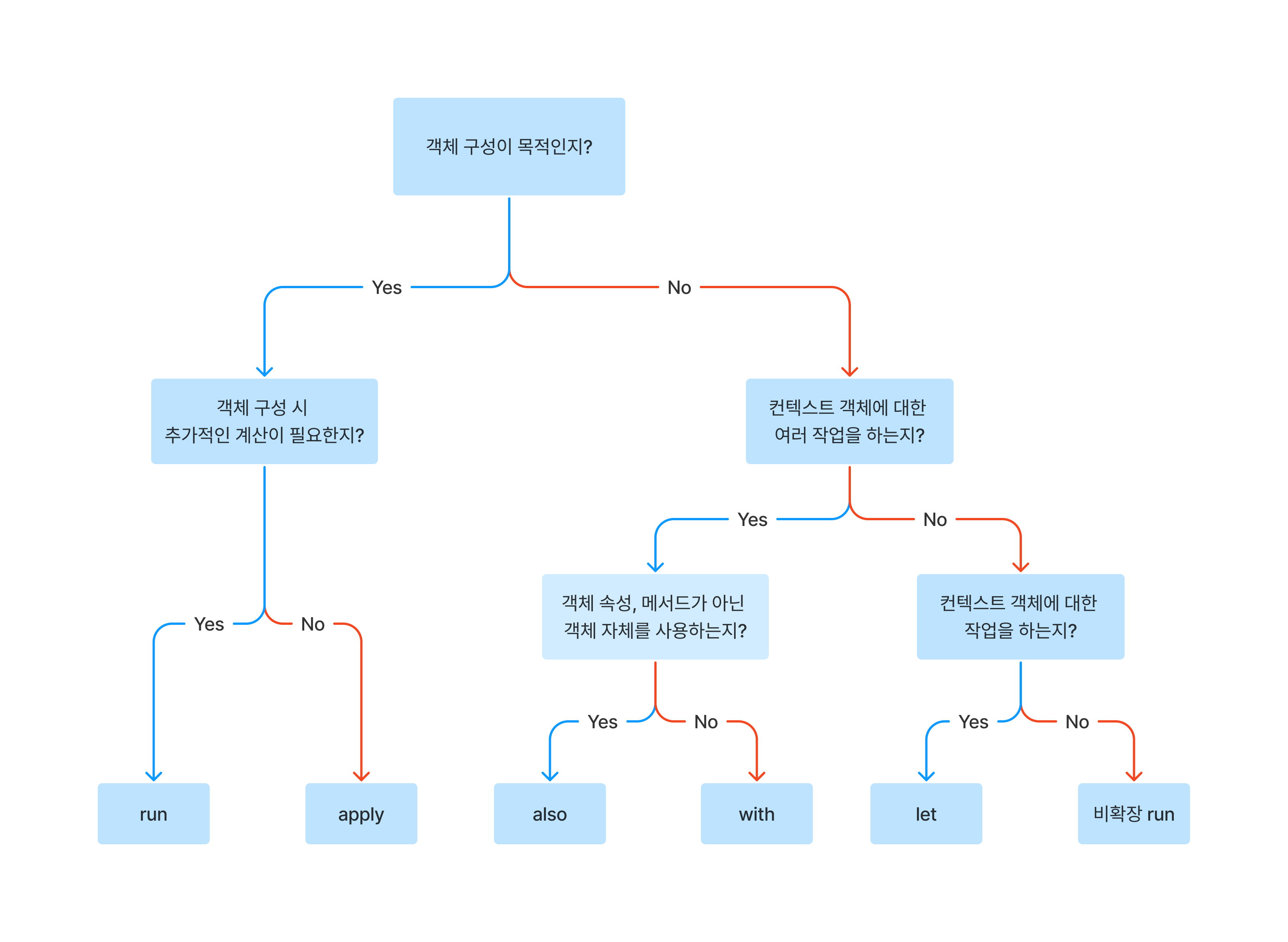 함수 객체 참조 방식 반환 값 확장 함수인지? let it 람다 블록 결과 Yes run this 람다 블록 결과 Yes run - 람다 블록 결과 No - 컨텍스트 객체 없이 사용한 경우 with this 람다 블록 결과 No - 컨텍스트 객체를 인자로 사용 apply this 객체 자신 Yes also it 객체 자신 Yes 일반적인 사용 가이드라인